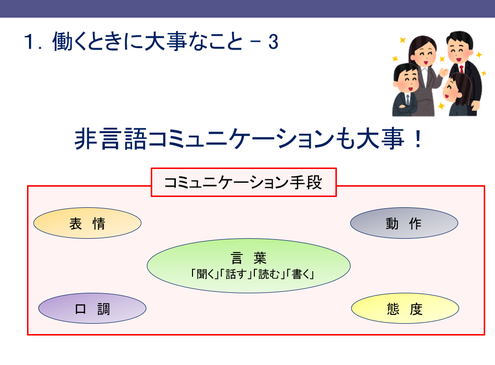コミュニケーションが大事であること、あいさつや身だしなみなどの職場でのマナーについて等をお伝えしました。